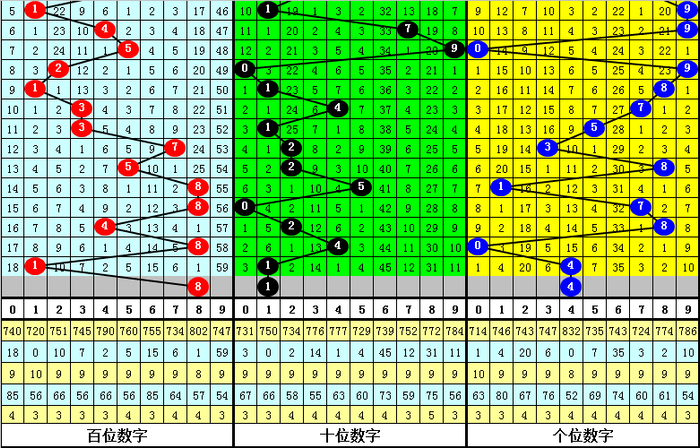 统计罗列三已开出的奖号发现,在考虑5期(第2026064期-第2026068)奖号为:528-851-807-428-840。