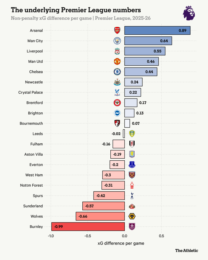 本赛季英超各队非点球预期进球差: