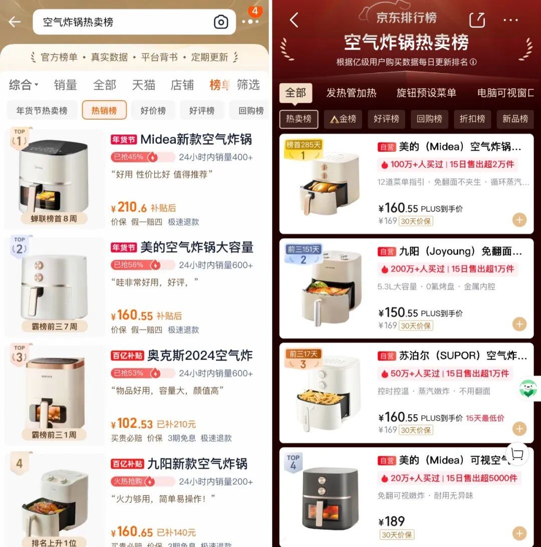 淘宝空气炸锅热销榜第别称产物,炫耀有跨越16万东谈主加购,24小时内单款就售出跨越400件;京东空气炸锅热卖榜的首位,累计销量更是跨越百万,15日售出跨越2万件,排在自后的两款产物也皆在半个月内卖出了跨越1万件。