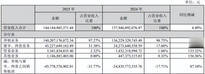 受到猪价下落影响,看成行业龙头的牧原股份也不成幸免地受到了影响,2025年销售商品猪7798.1万头,罢了营业收入1441.45亿元,同比增长4.49%;净利润158.12亿元,同比下落16.45%。不外,在靠近这一次猪周期的时代,牧原股份有着更强的底气:孳生老本络续下落、欠债限制大幅缩减、宰杀业务首度盈利。