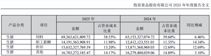 牧原股份也确乎作念到了。年报裸露,牧原股份2025年全年生猪孳生十足老本约12元/公斤,较上年同期裁汰约2元/公斤。