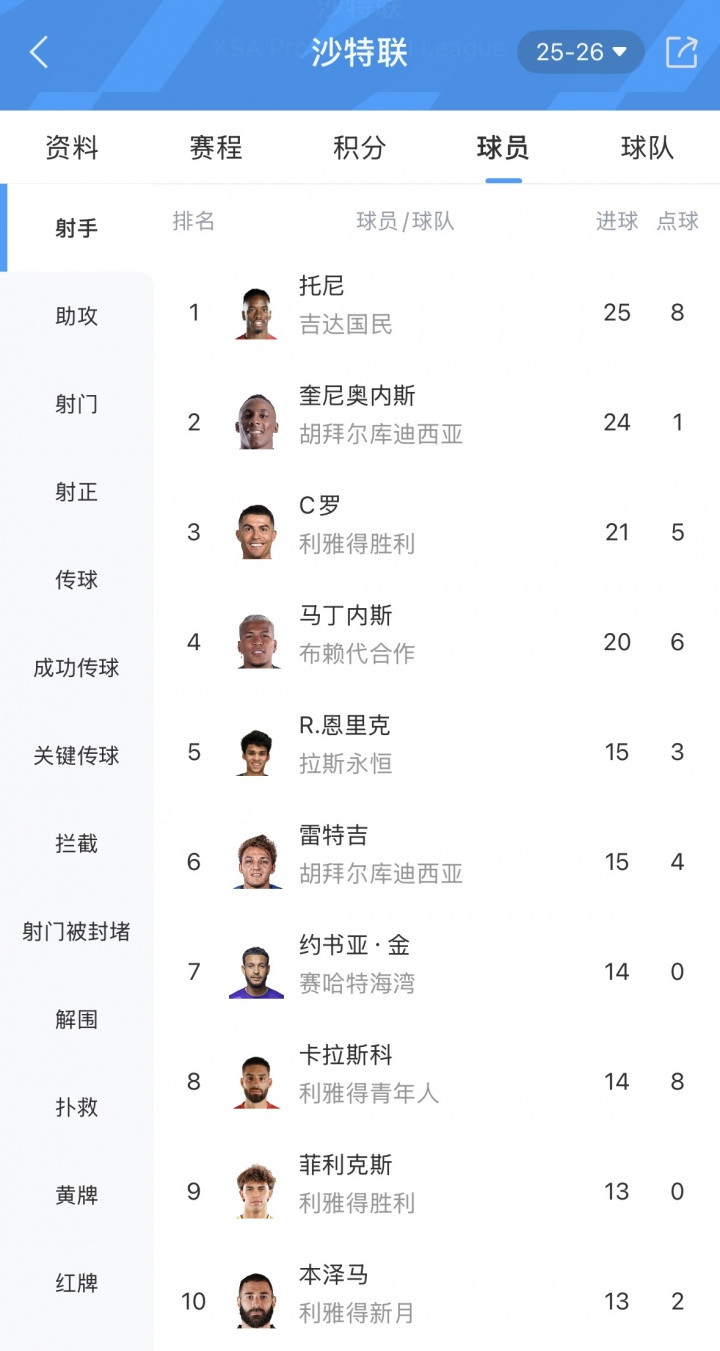 在沙特联弓手榜上,伊万·托尼25球独自领跑,奎尼奥内斯24球第二,C罗21球第三。