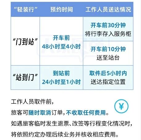 “轻装行”是铁路部门为游客出行提供的“门到站”“站到门”同城行李搬运干事。在同城距离车站35公里内,游客凭证践诺需要可采取以下两种“轻装行”干事: