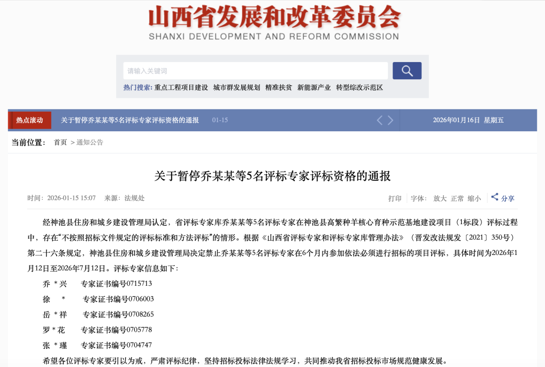 1月15日,山西省发改委发布通报称,经神池县住房和城乡开辟解决局认定,省评标群众库乔某某等5名评标群众在神池县高繁种羊中枢育种示范基地开辟时势(1标段)评标经由中,存在“不按照招标文献端正的评标程序和设施评标”的情形。