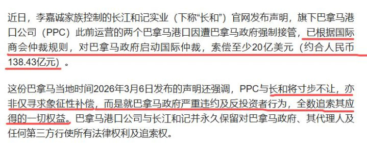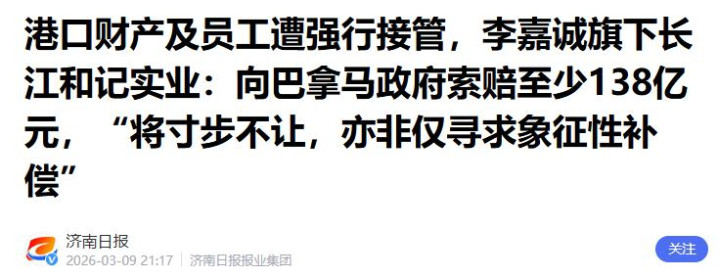 济南日报——2026年3月9日——口岸财产及职工遭强行收受,李嘉诚旗下长江和记实业:向巴拿马政府索赔至少138亿元,“将绝不让步,亦非仅寻求符号性抵偿”