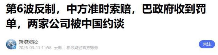 参考信息:新浪财经——2026年3月11日——第6波反制,中方准时索赔,巴政府收到罚单,两家公司被中国约谈